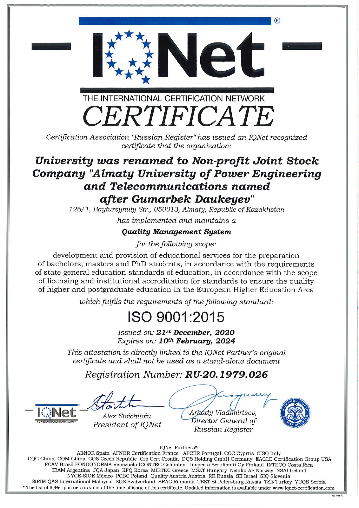 ISO 9001:2015 сапа менеджменті жүйесінің халықаралық сертификаты (IQNet)